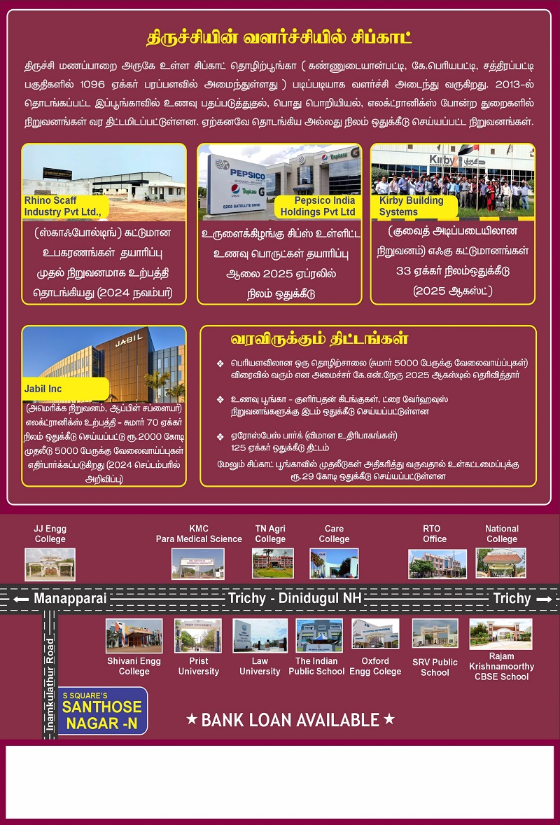 Welcome to S Square’s Santhose Nagar – N, a thoughtfully planned residential layout developed by S Square Housing Private Limited. Designed for families seeking secure investment, excellent connectivity, and peaceful living, Santhose Nagar – N offers premium plots in one of Trichy’s fast-developing locations.